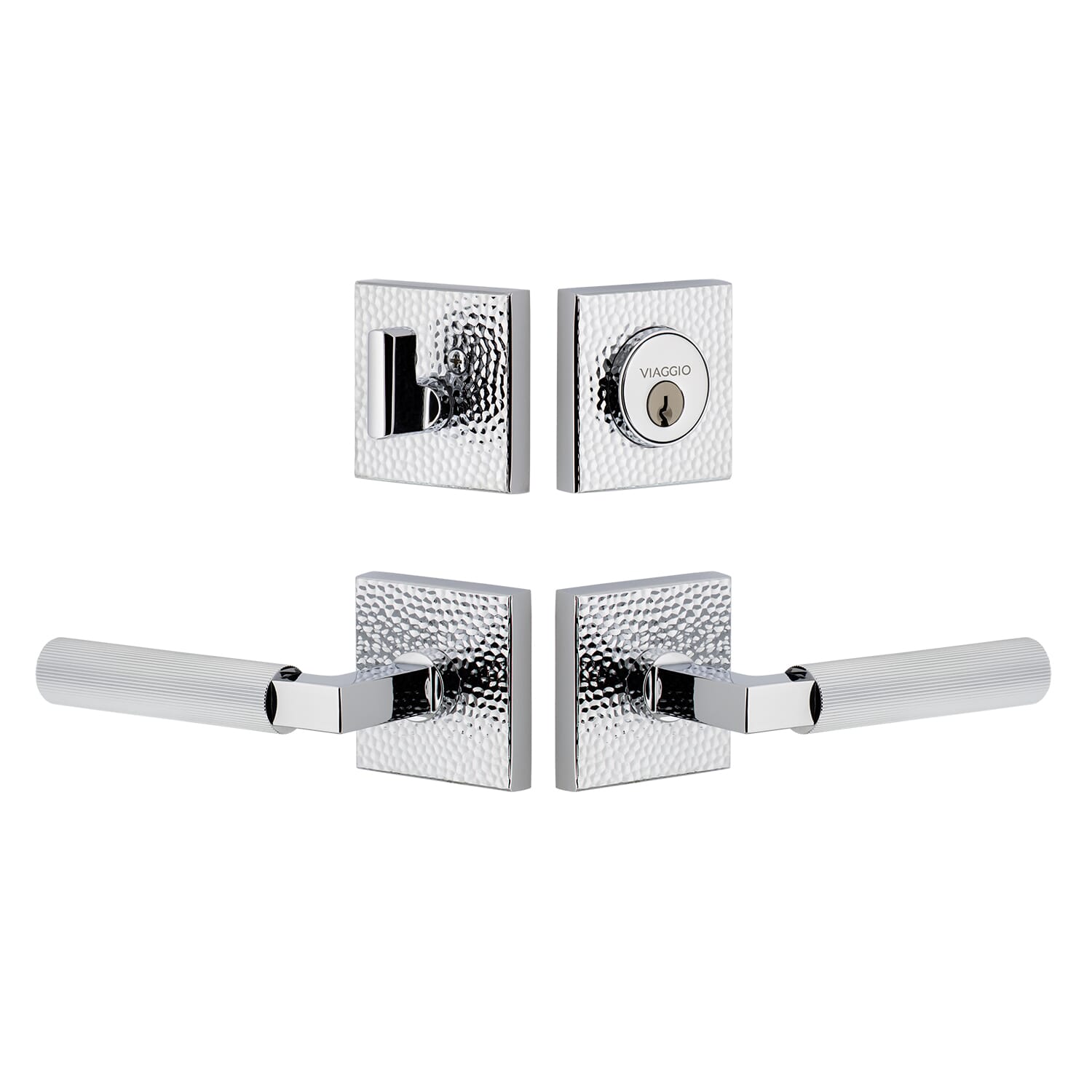 Quadrato Hammered Rosette Entry Set with Contempo Fluted Lever in Bright Chrome