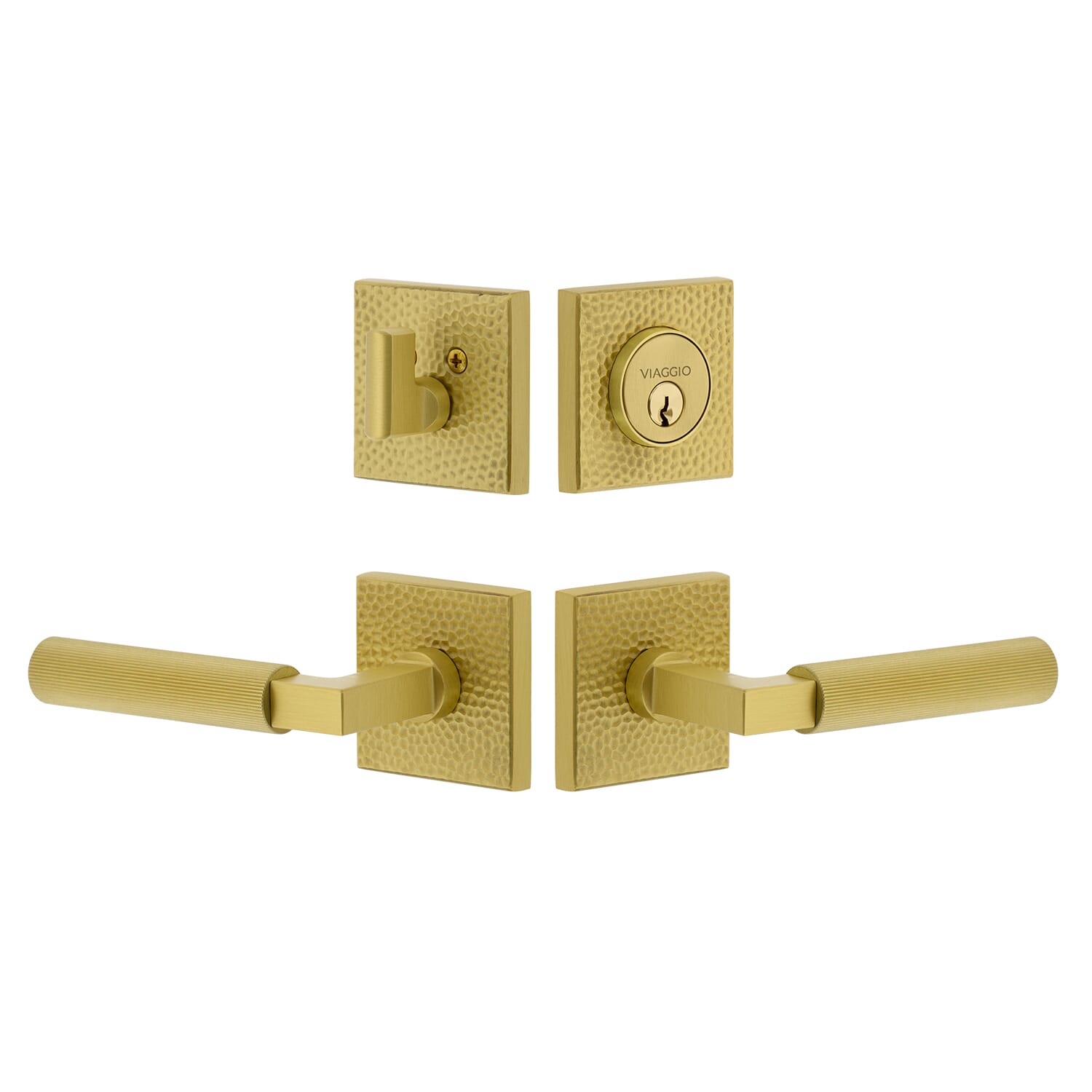 Quadrato Hammered Rosette Entry Set with Contempo Fluted Lever in Satin Brass