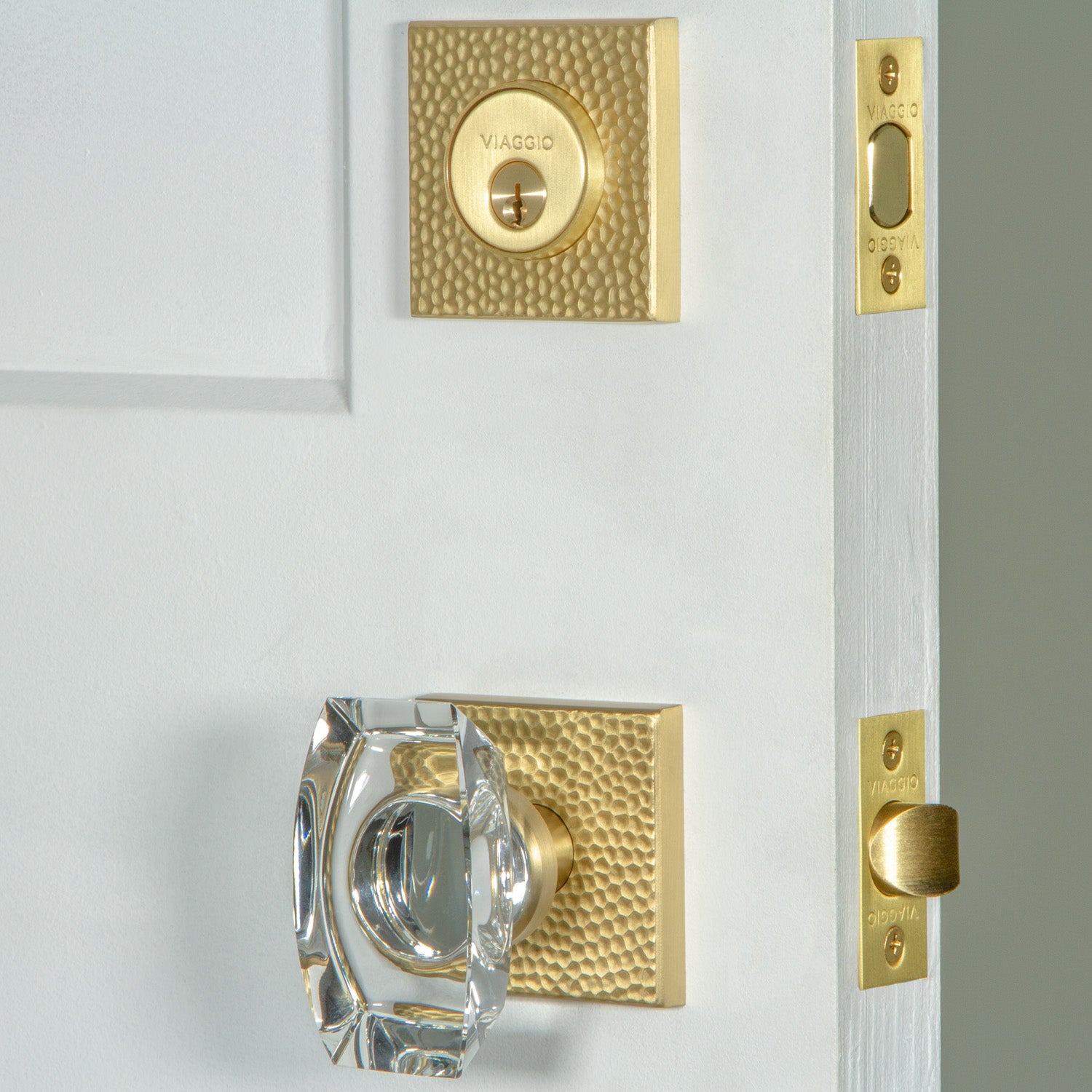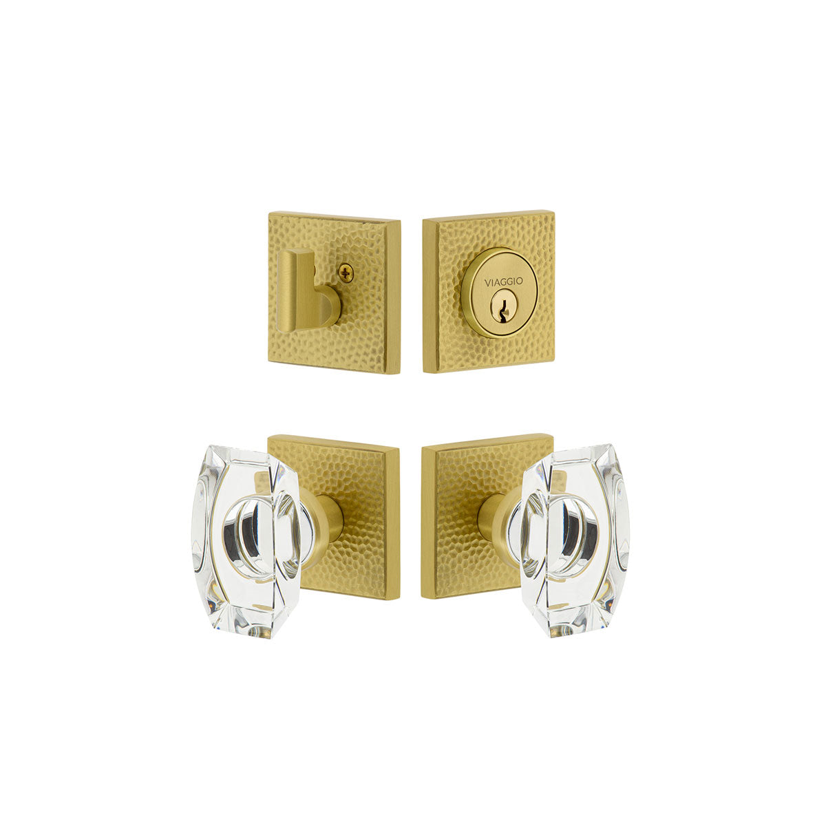 Quadrato Hammered Rosette Entry Set with Quadrato Crystal Knob in Satin Brass