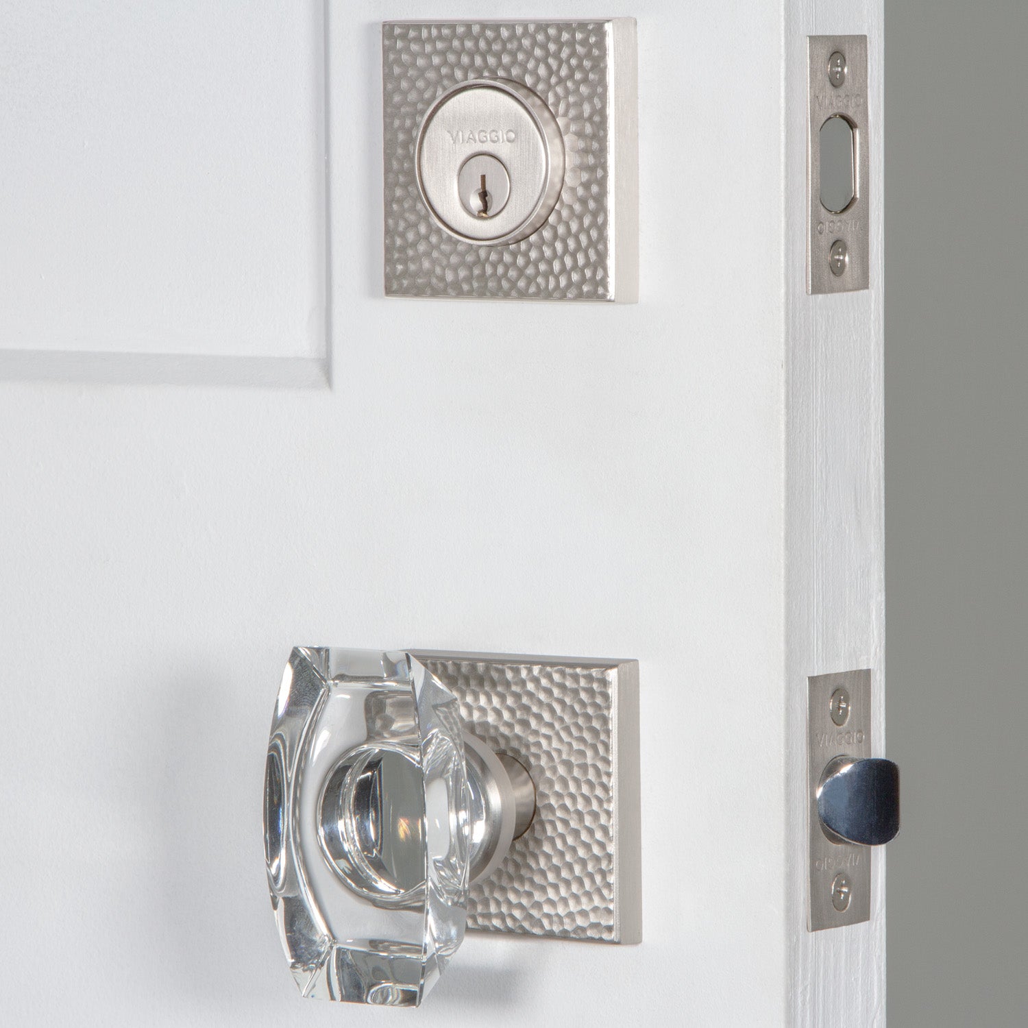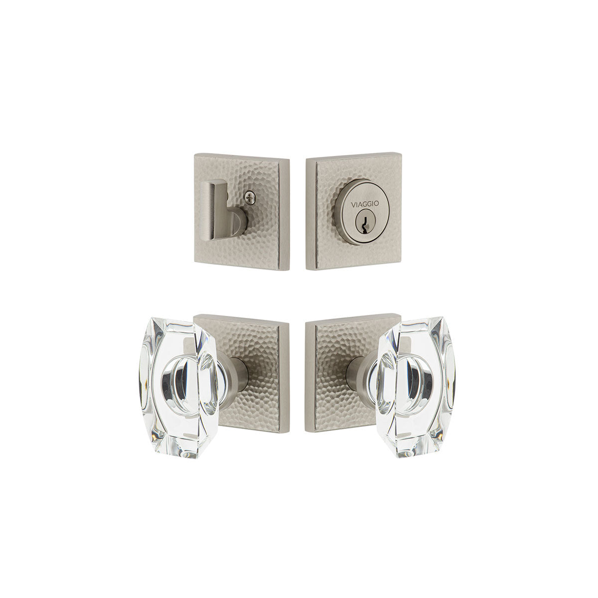 Quadrato Hammered Rosette Entry Set with Quadrato Crystal Knob in Satin Nickel