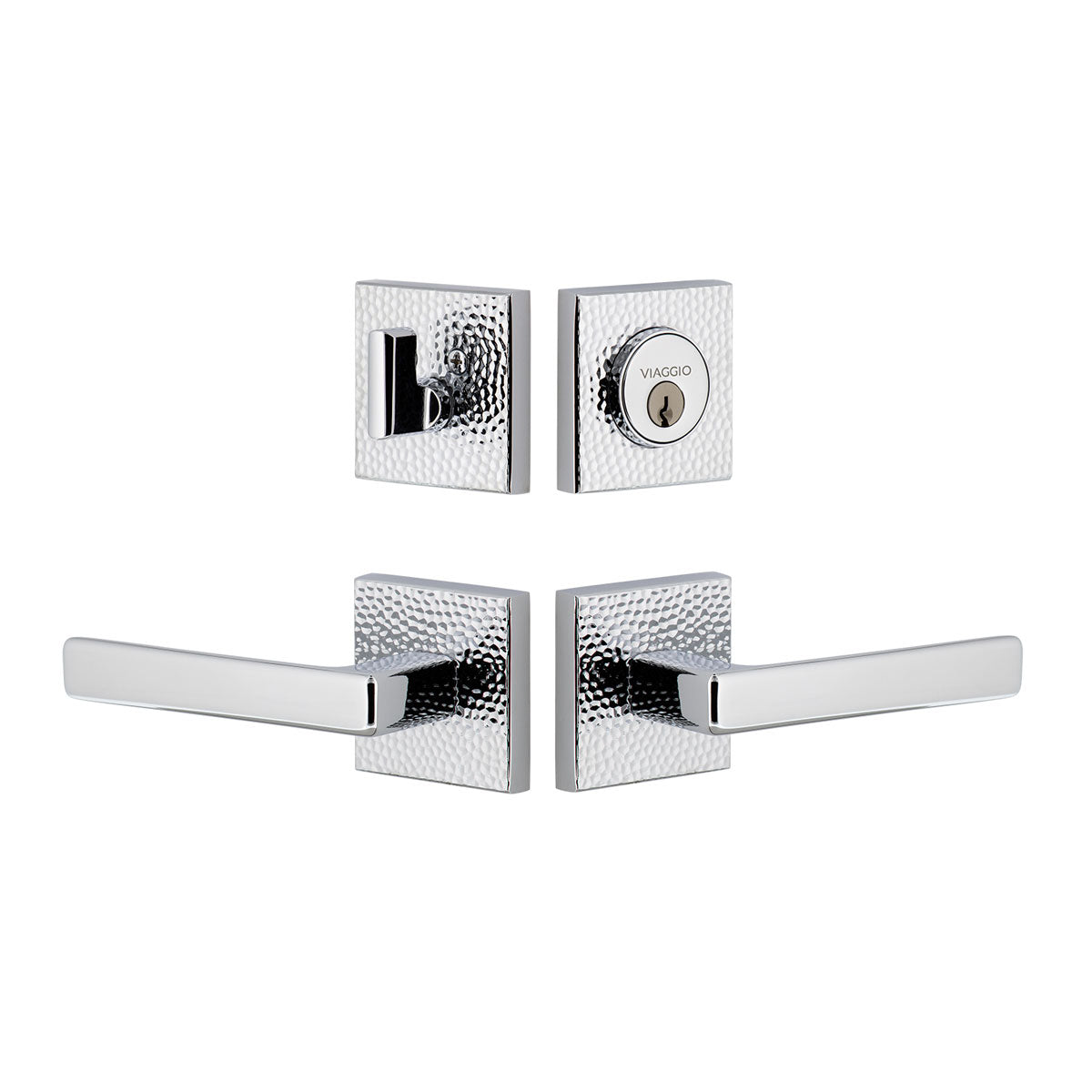 Quadrato Hammered Rosette Entry Set with Moderno Lever in Bright Chrome