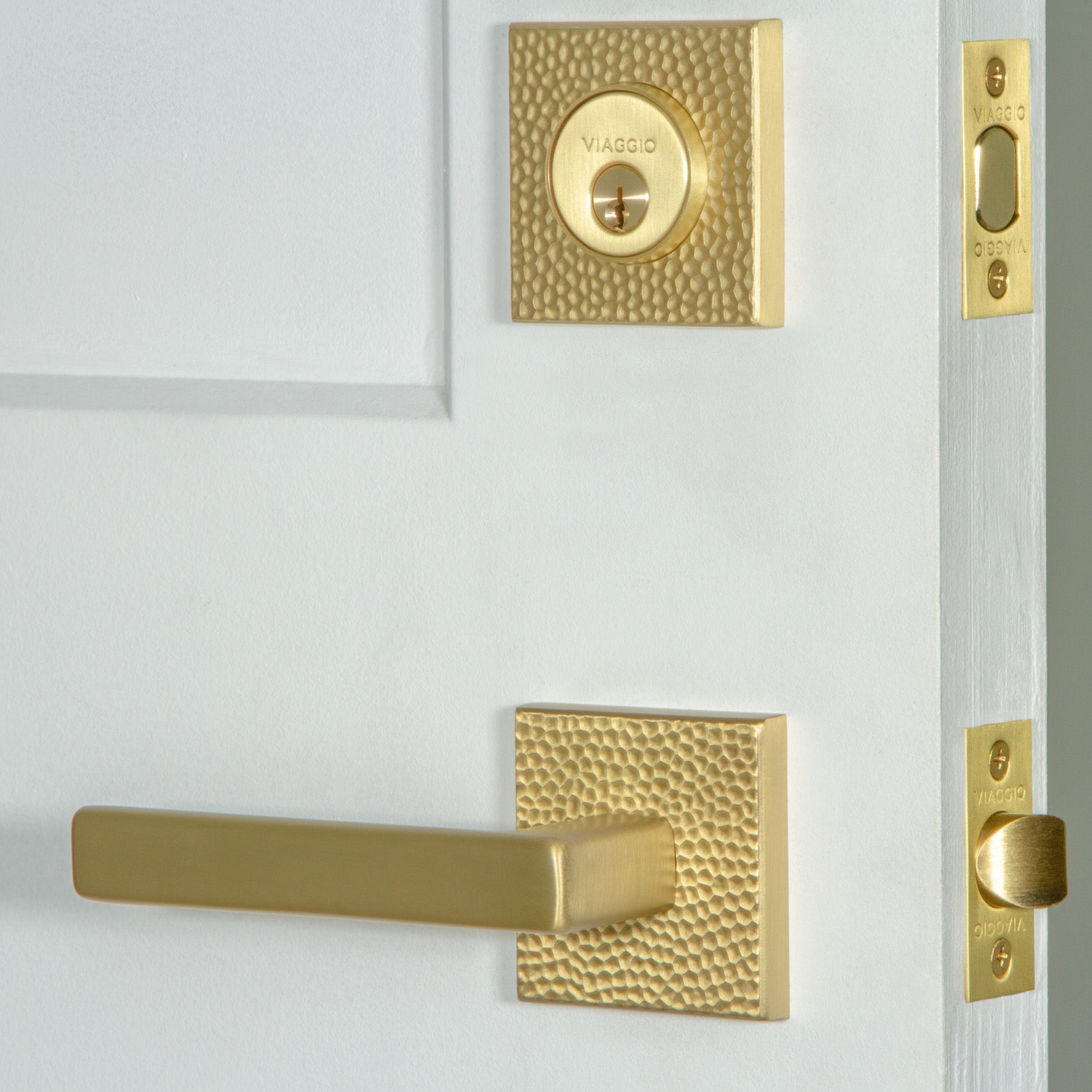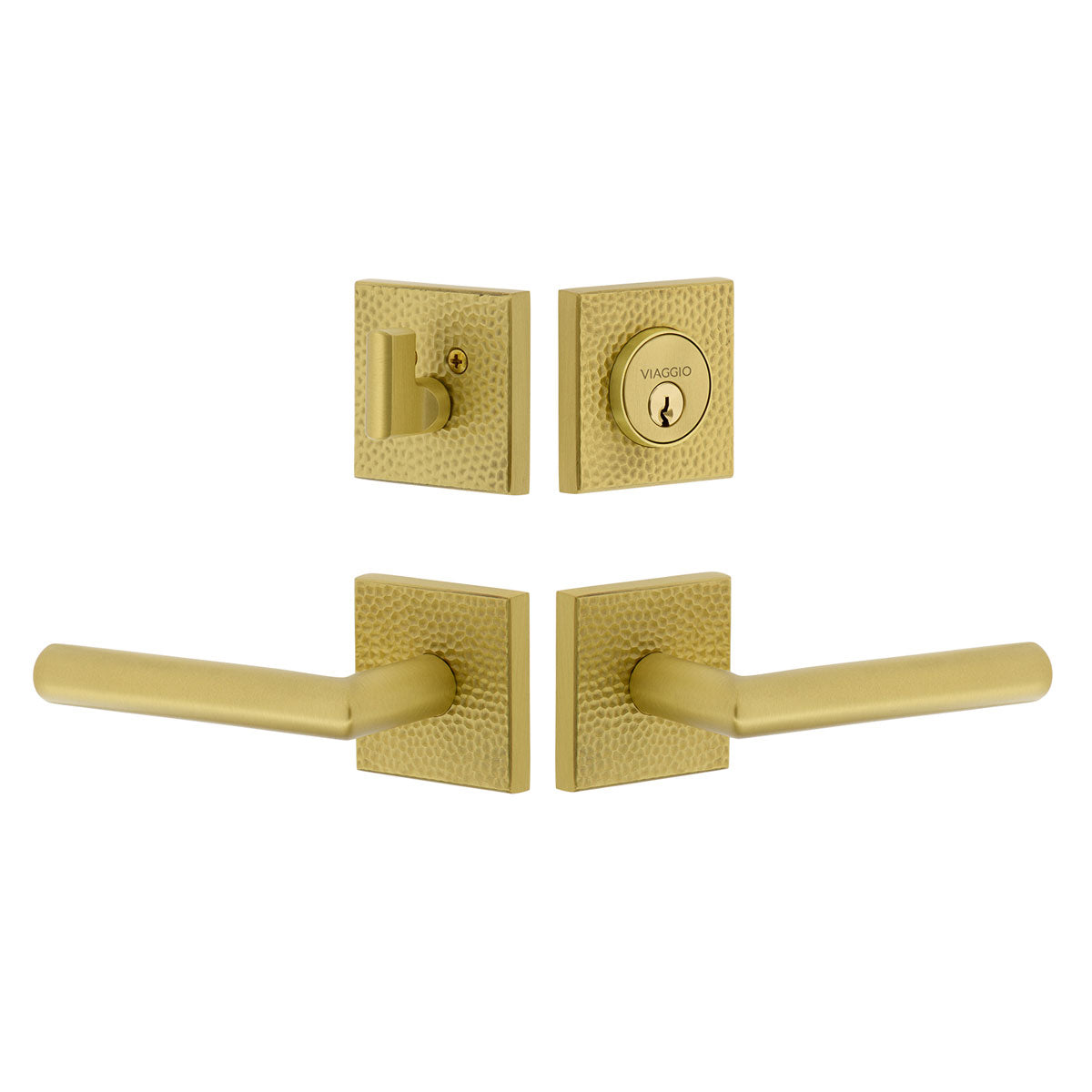 Quadrato Hammered Rosette Entry Set with Lusso Lever in Satin Brass
