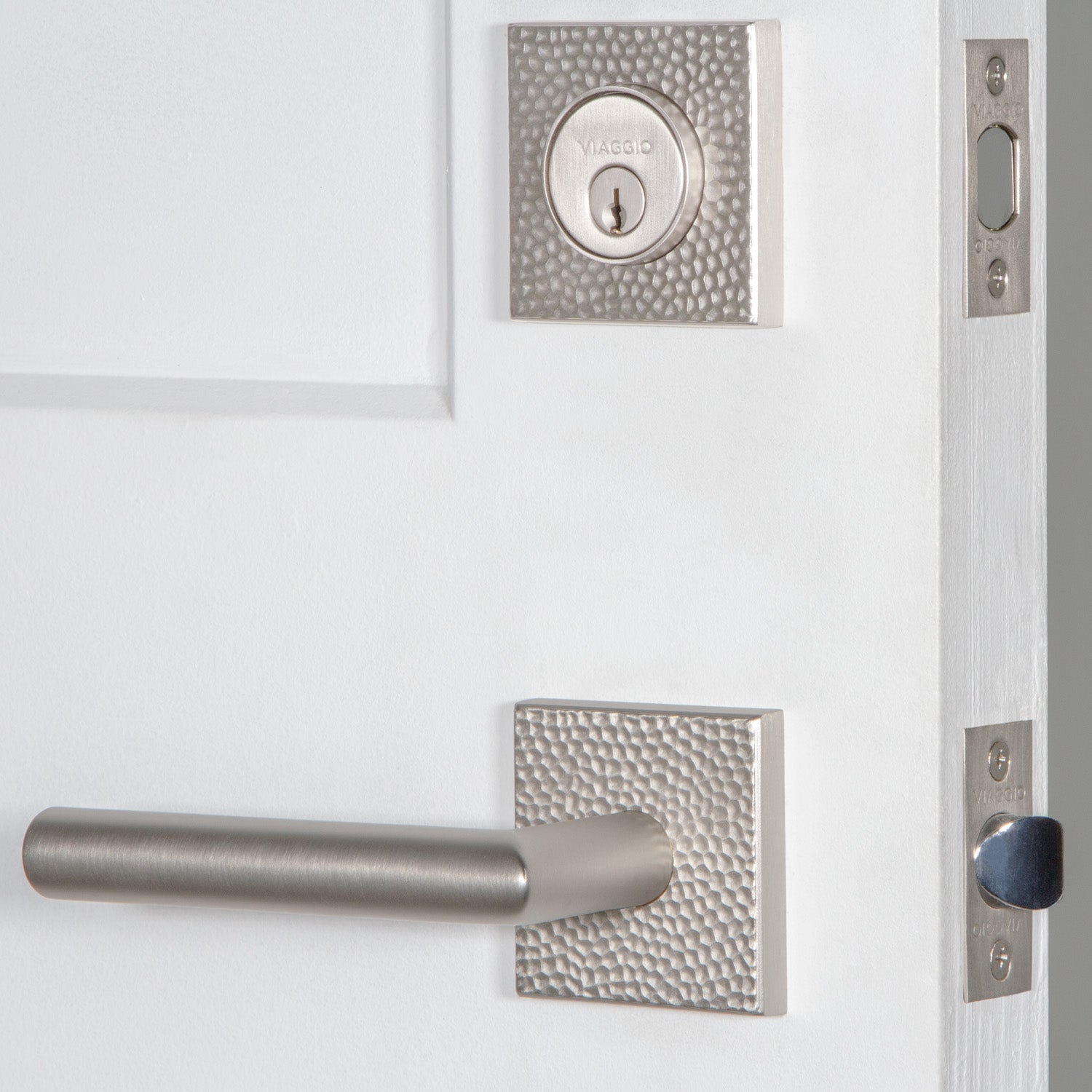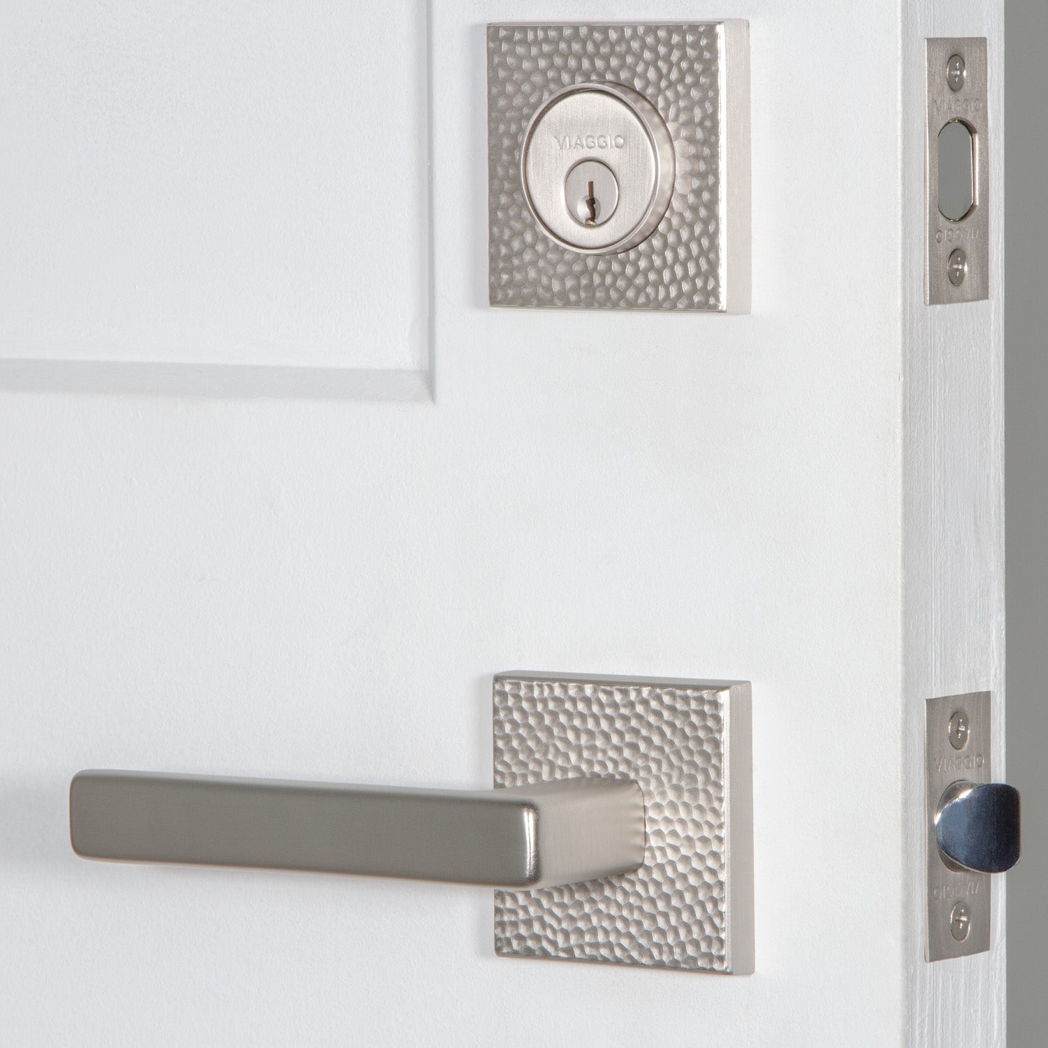 Quadrato Hammered Rosette Entry Set with Lusso Lever in Satin Nickel