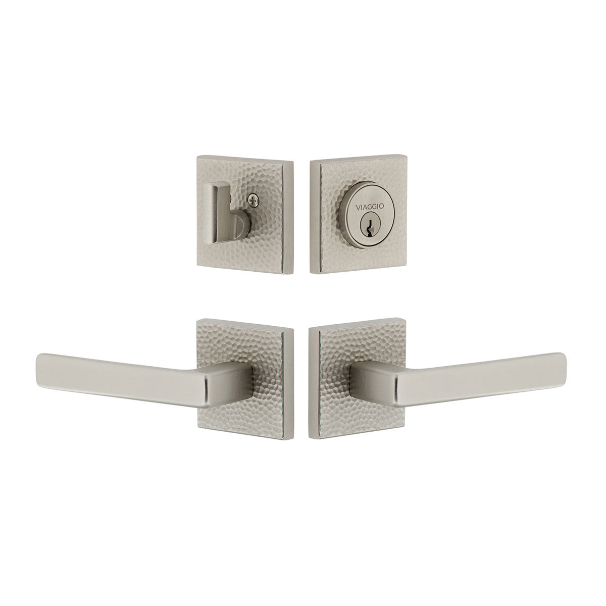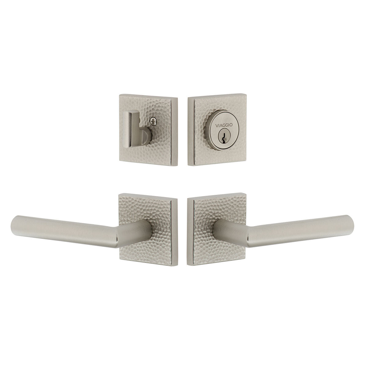 Quadrato Hammered Rosette Entry Set with Moderno Lever in Satin Nickel