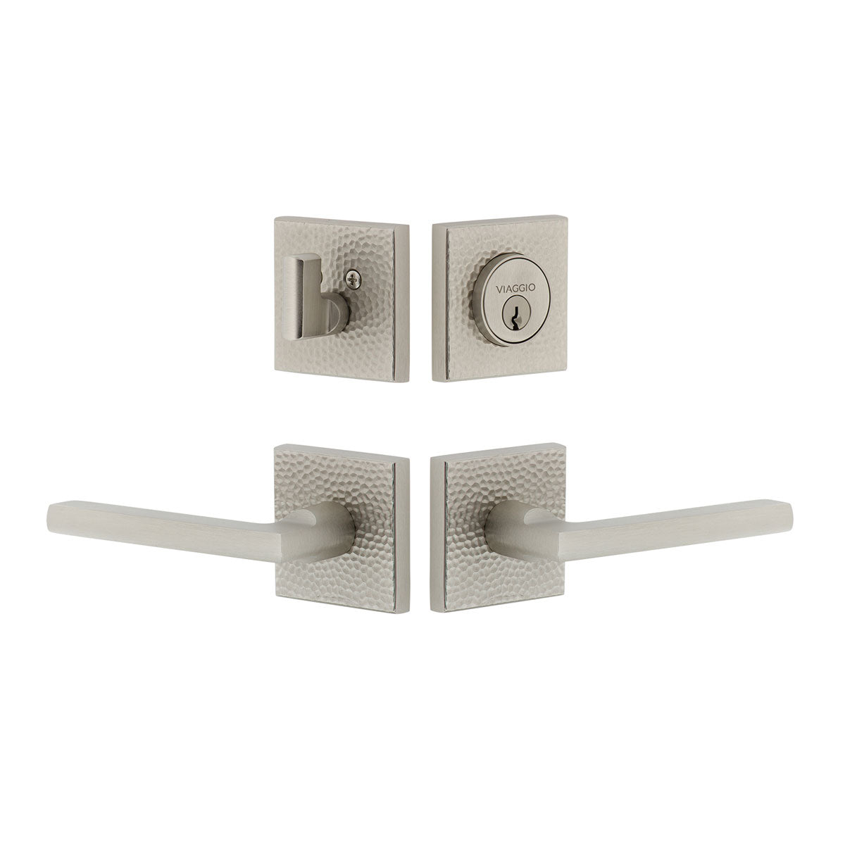 Quadrato Hammered Rosette Entry Set with Milano Lever in Satin Nickel