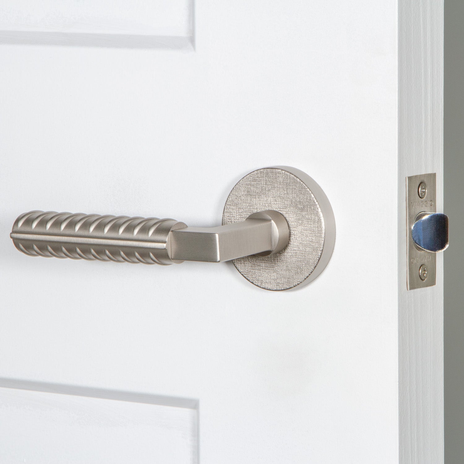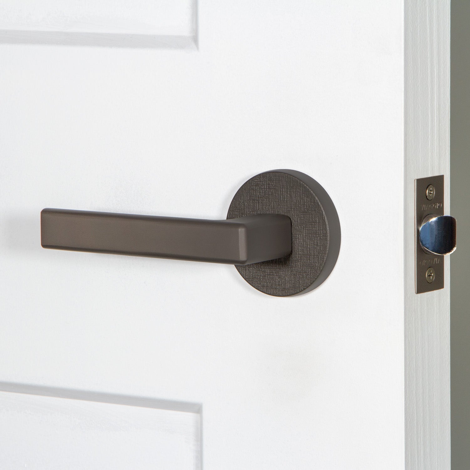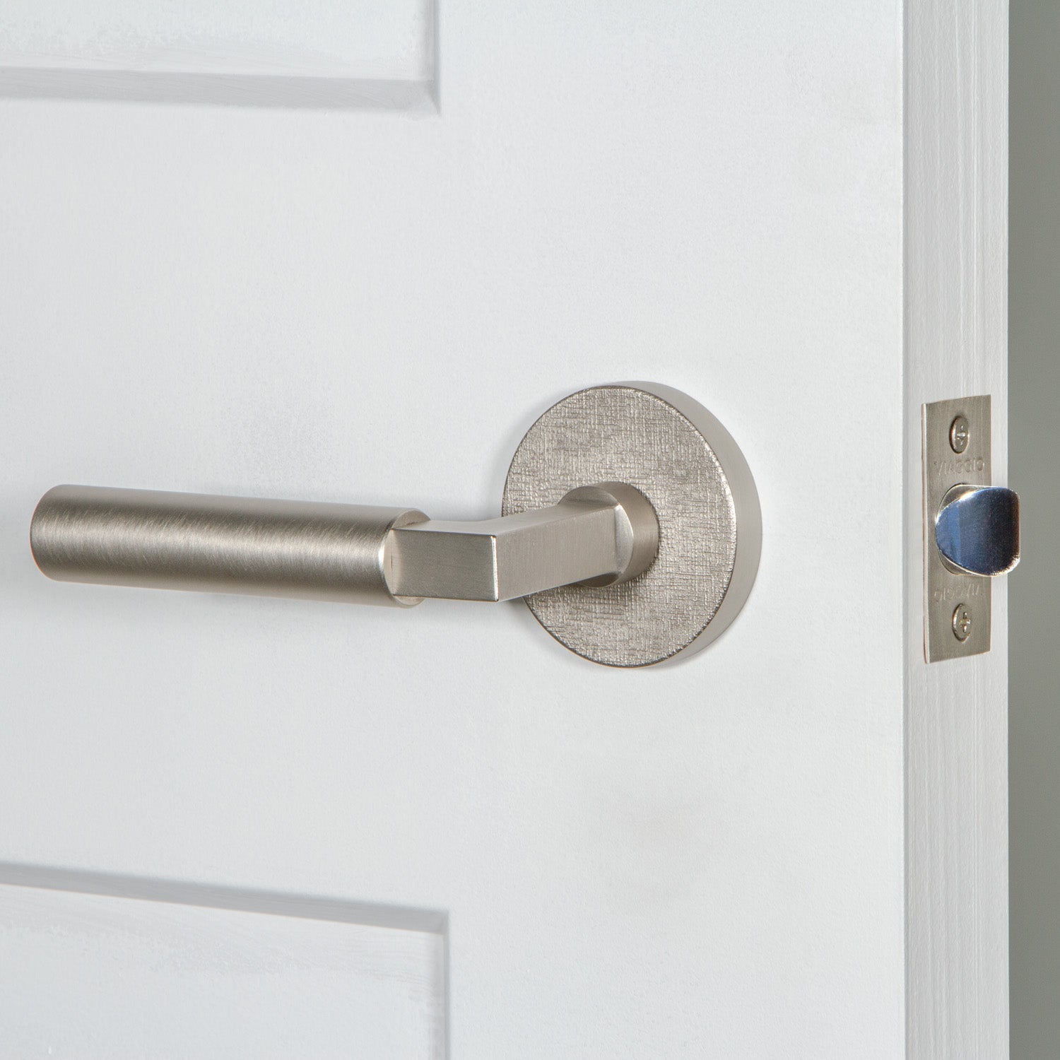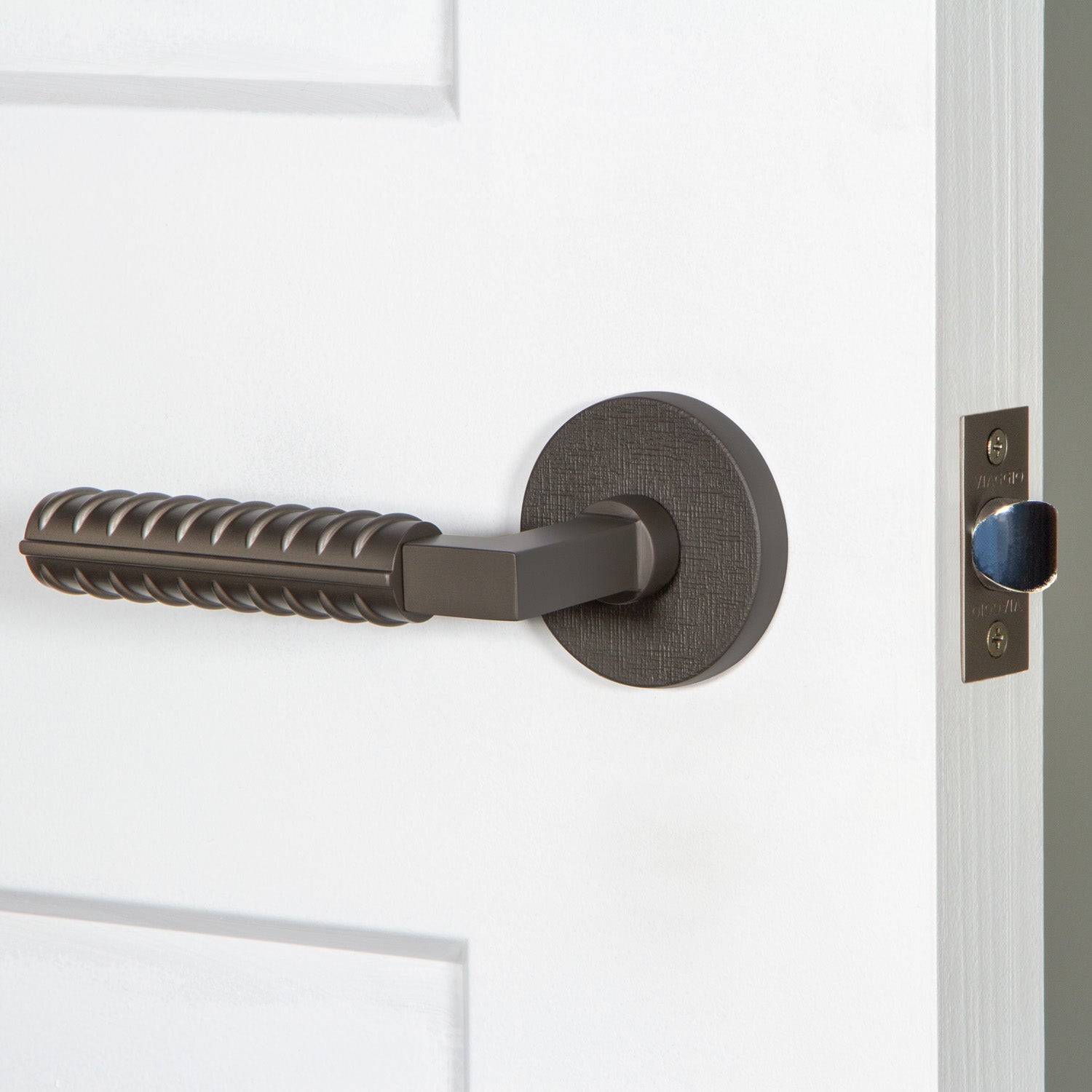 Our Motivo Collection includes rosettes and levers with natural and industrial textures including leather, linen, hammered, and rebar. When paired with a smooth knob or lever, textured rosettes create an imaginative juxtaposition to delight the eye.