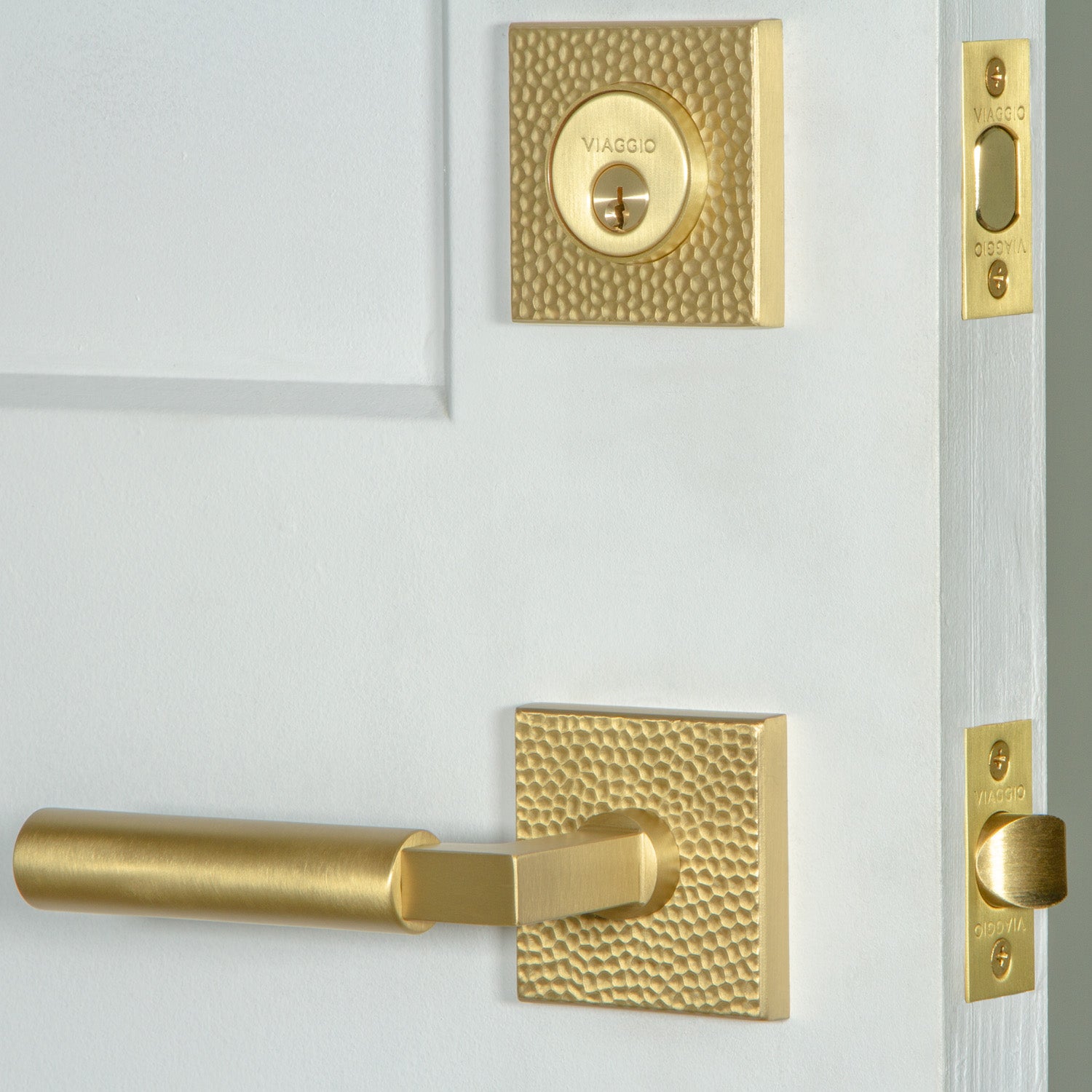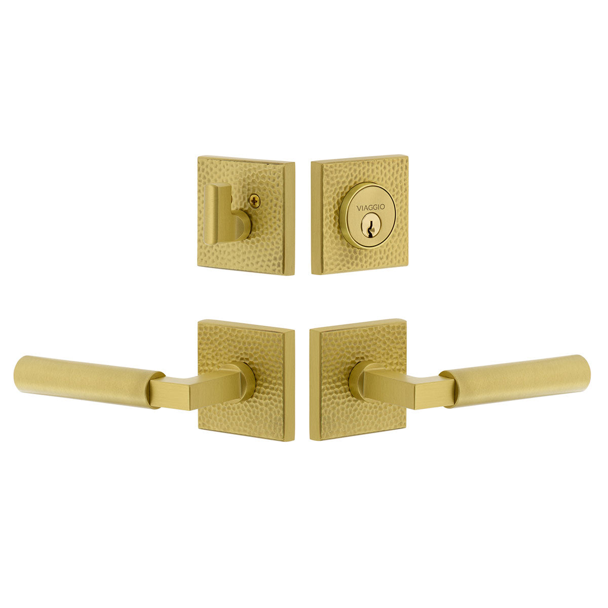 Quadrato Hammered Rosette Entry Set with Contempo Lever in Satin Brass