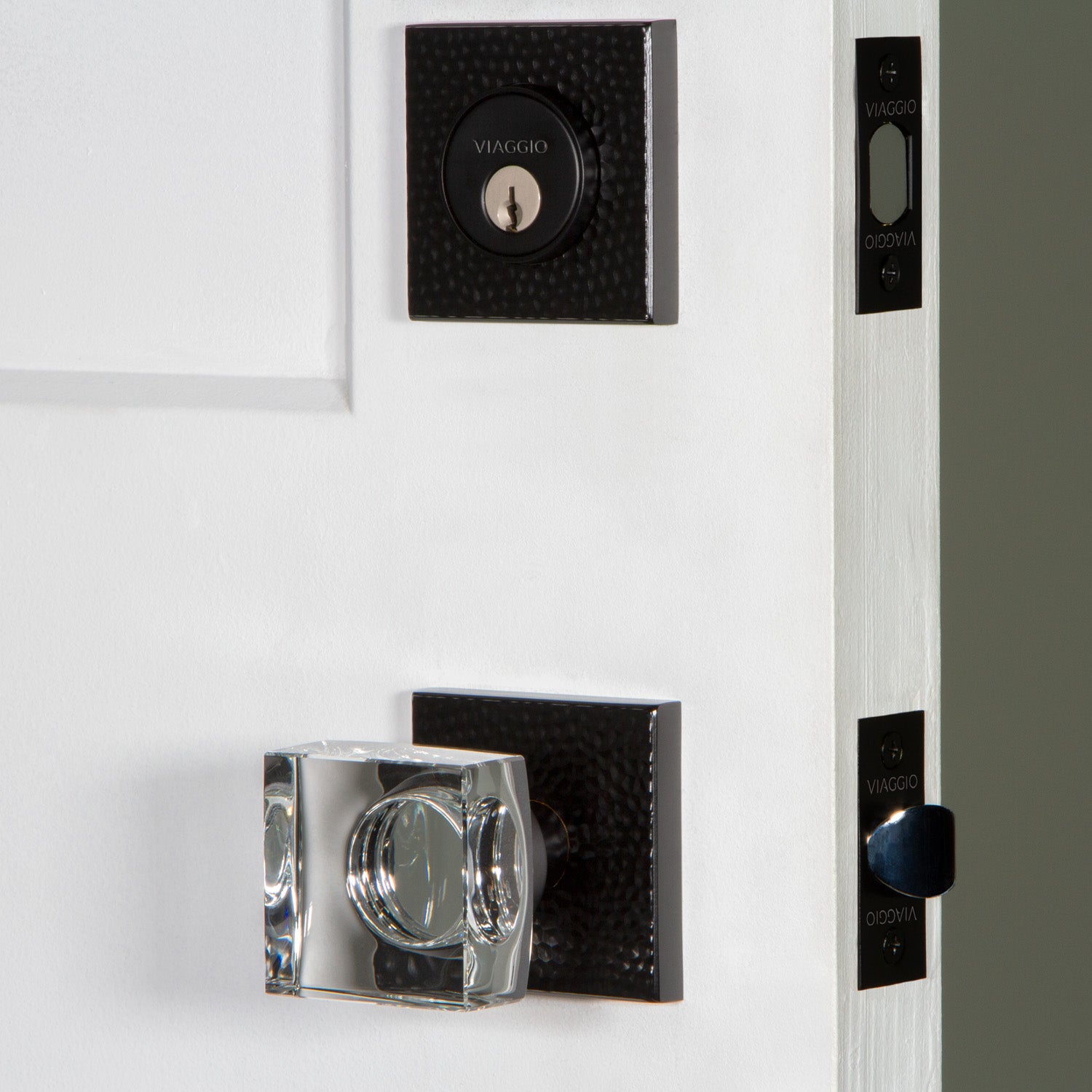 Quadrato Hammered Rosette Entry Set with Quadrato Crystal Knob in Satin Black