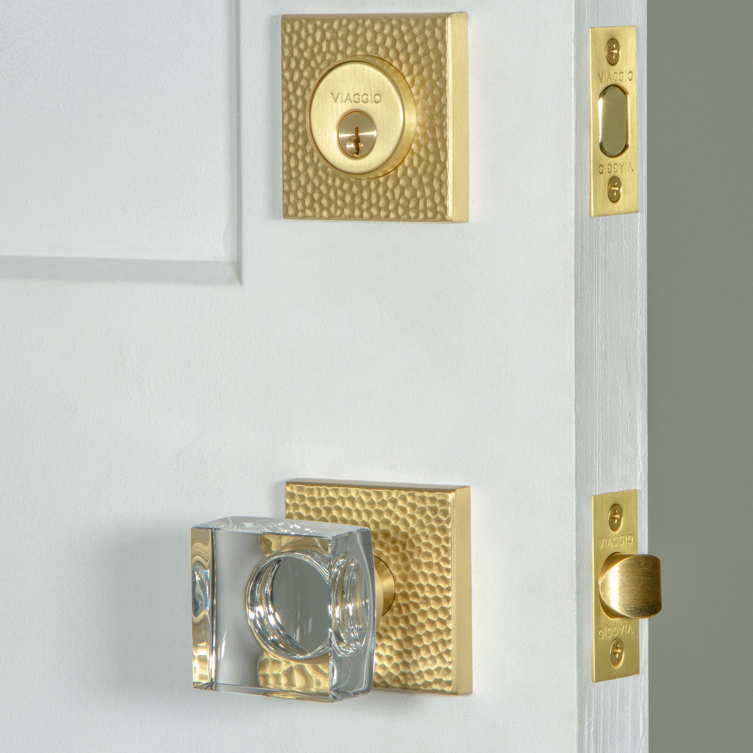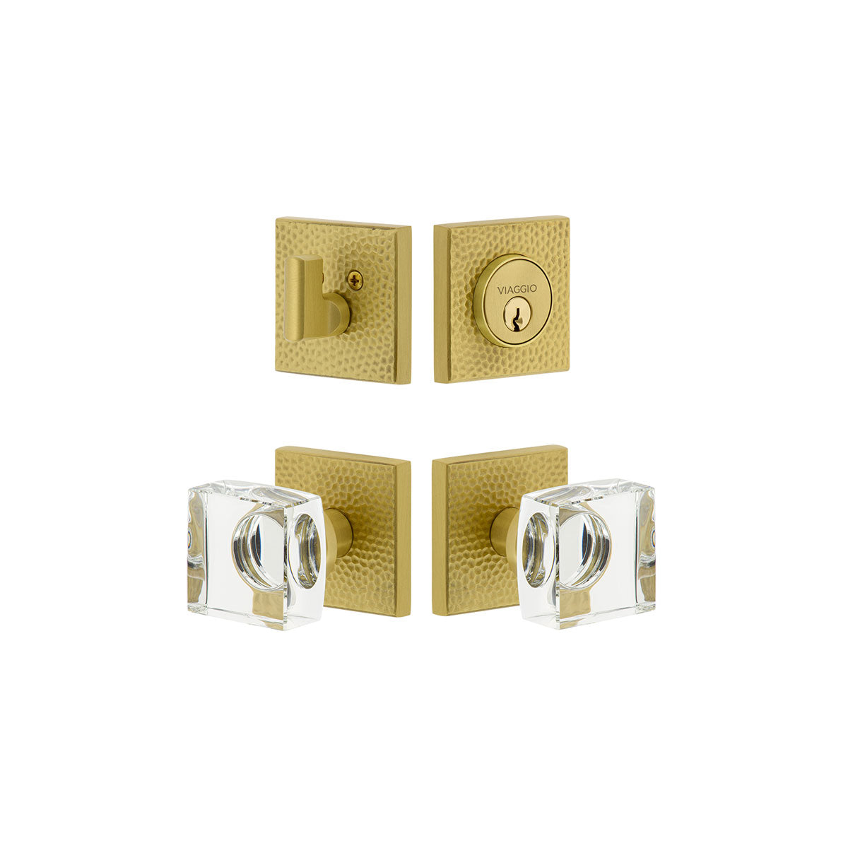 Quadrato Hammered Rosette Entry Set with Quadrato Crystal Knob in Satin Brass
